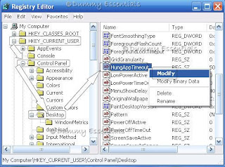 Now follow by selecting 'HungAppTimeout', on the right hand side of the window itself and follow the same procedure of Right clicking and selecting 'Modify'